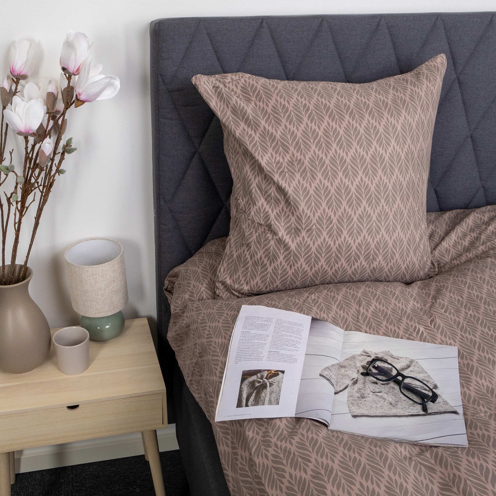 Både dynetrekk og putetrekk lukkes med glidelås, som sikrer at dyne og pute blir på plass, og gjør det enkelt å skifte sengetøy. Det brune mønsteret skaper et rolig og dekorativt uttrykk som passer inn i både moderne og klassiske soverom.