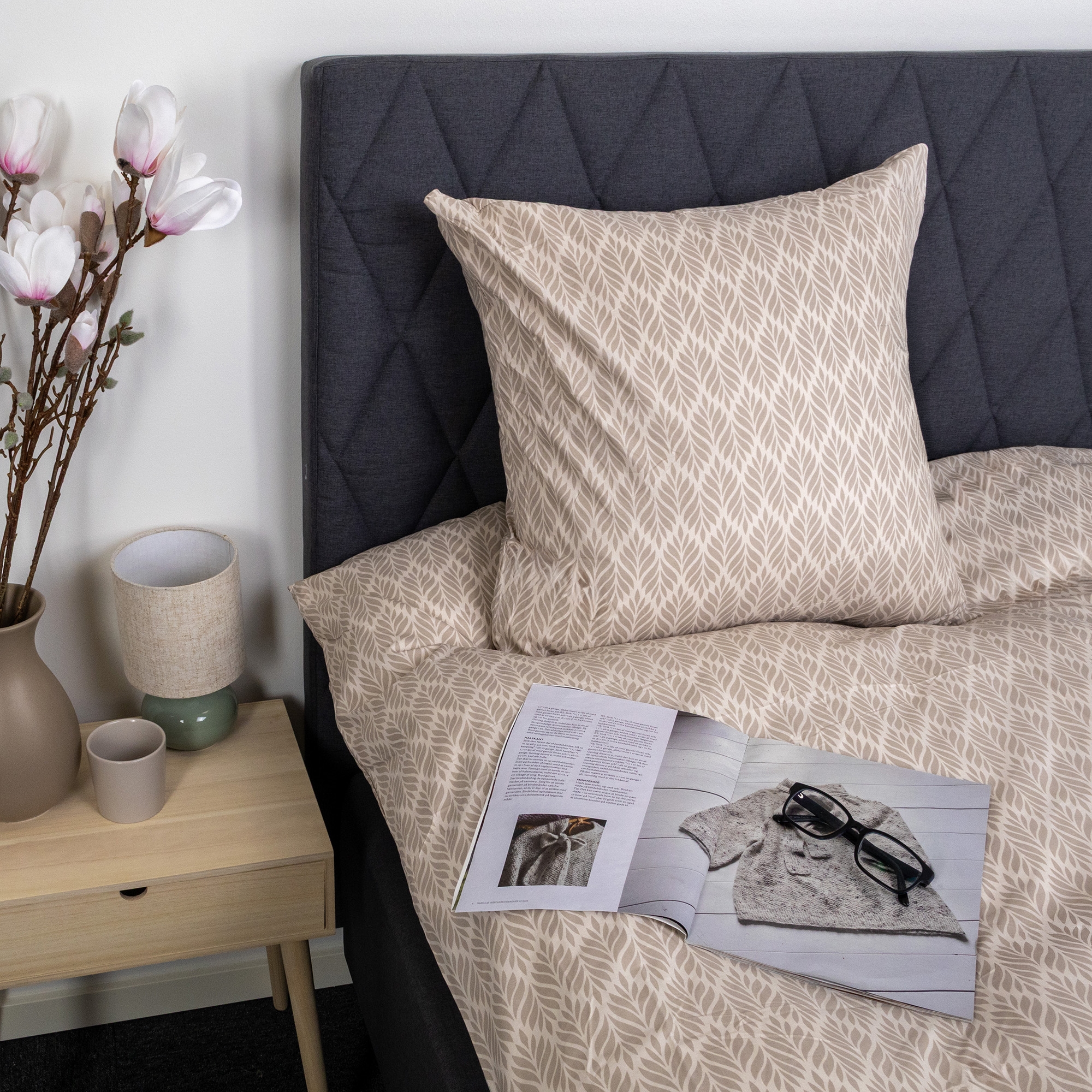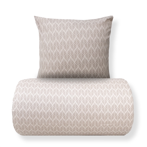 Både dyne- og putetrekk lukkes med glidelås, som sikrer at dyne og pute holder seg på plass og gjør det enkelt å skifte sengetøy. Det sandfargede mønsteret skaper et rolig og dekorativt uttrykk som passer inn i både moderne og klassiske soverom.
