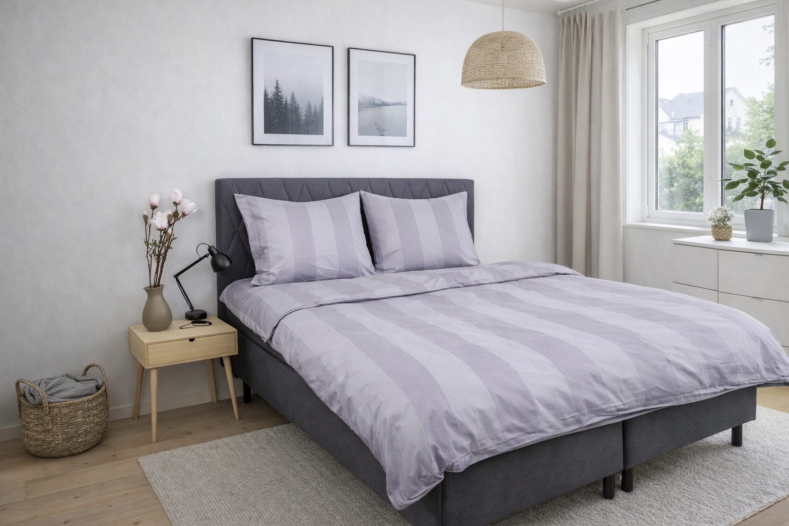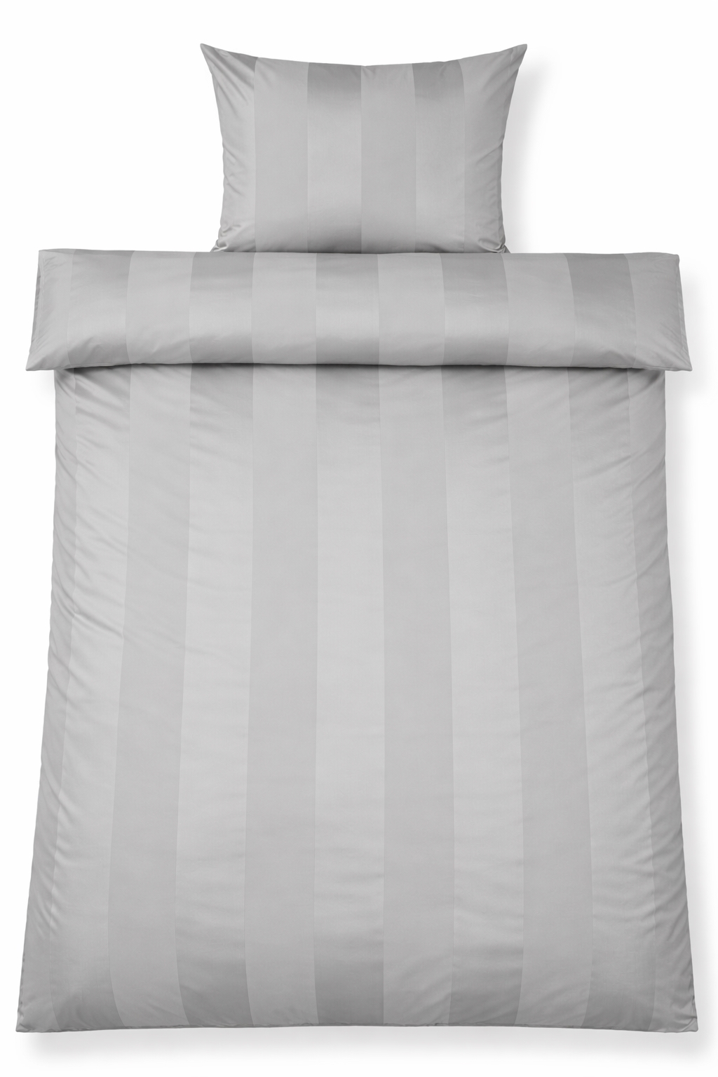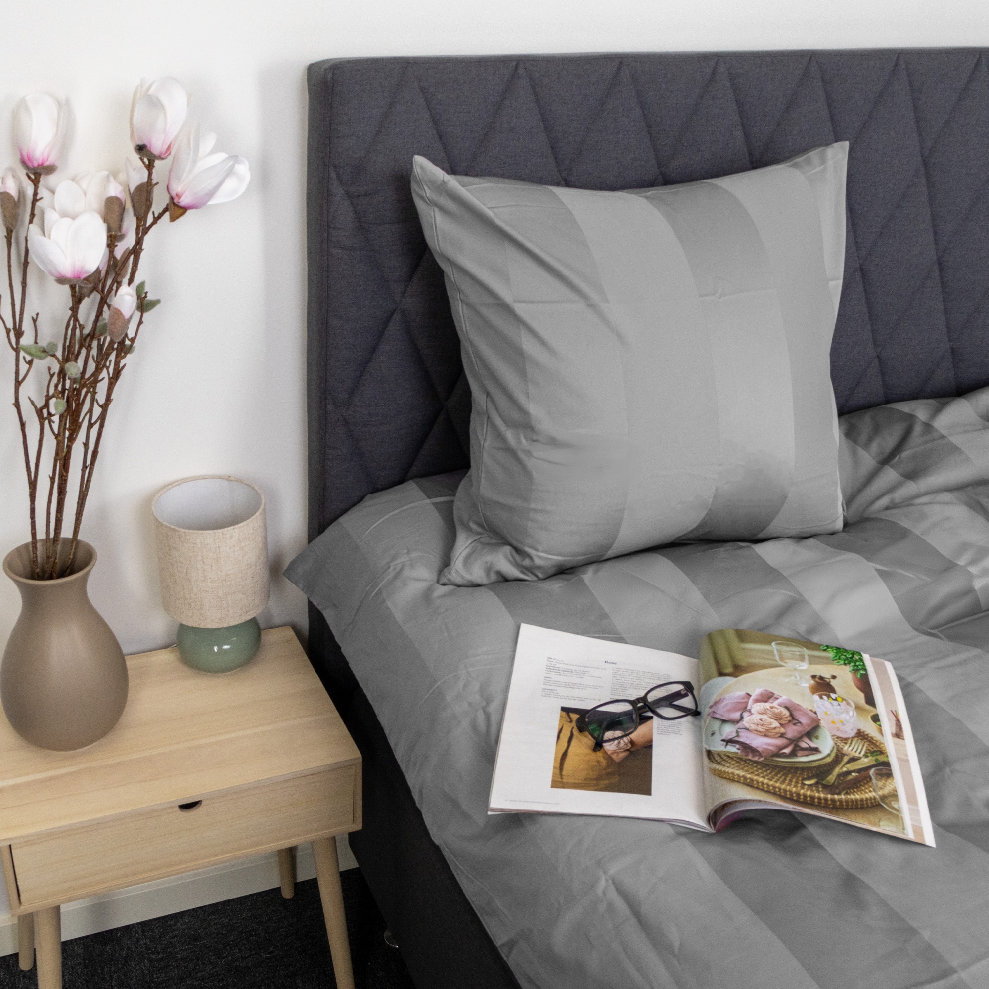 Skap en eksklusiv hotellstemning på soverommet med dette gråstripete sengetøyet i 100% bomullssatin. Det elegante designet med brede jacquardvevde striper kombinerer tidløs minimalisme med luksuriøs komfort og er perfekt for deg som ønsker et stilrent og innbydende sovemiljø.
