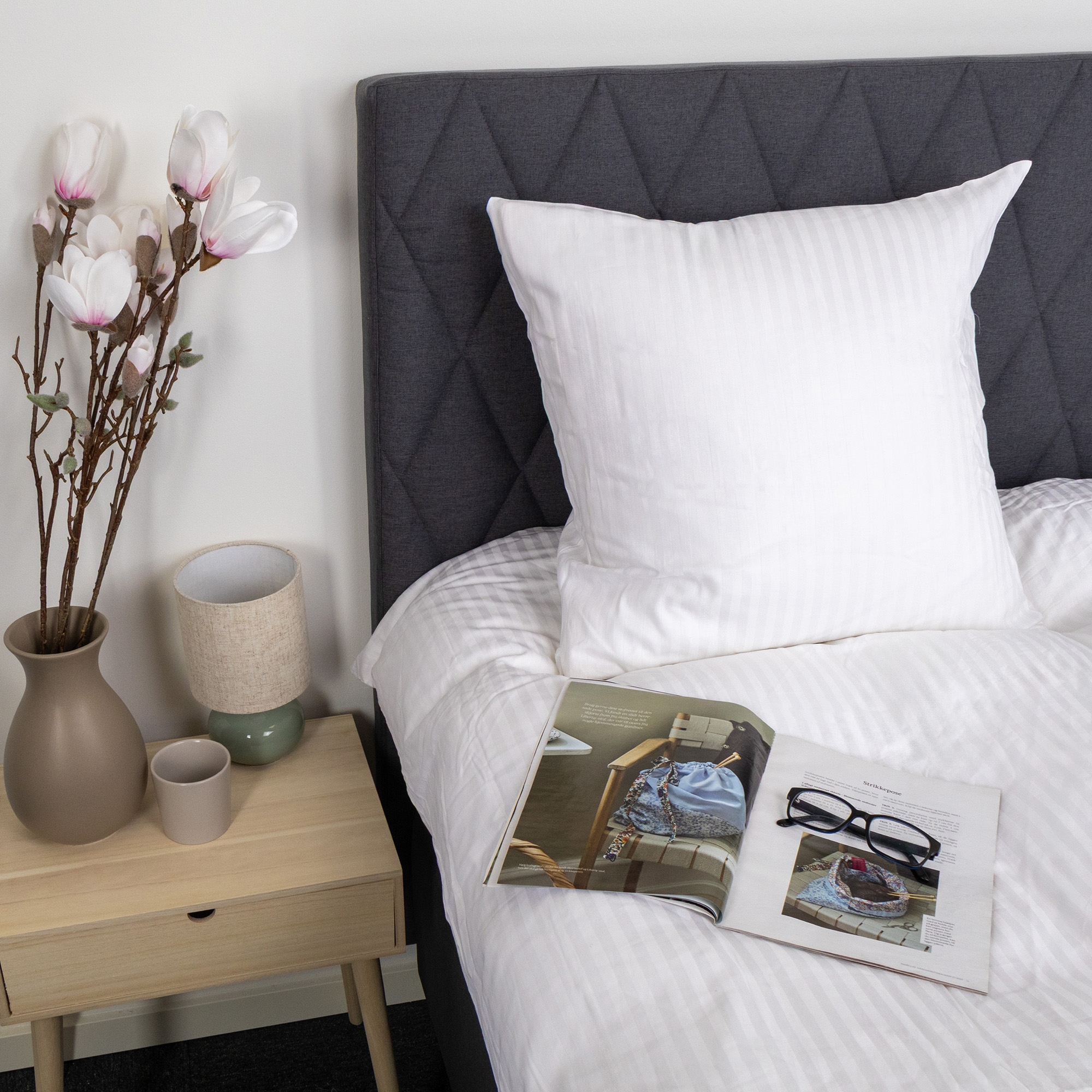 Bomullssatin er vevd i en fin satinveving, som gir en glatt, myk og behagelig overflate mot huden. Den ekstra fine trådtettheten på 220TC sikrer en tett og slitesterk kvalitet, som kjennes behagelig natt etter natt og holder formen vask etter vask. Samtidig bevarer materialet bomullens naturlige pusteevne, så du får et behagelig sovemiljø hele året.
