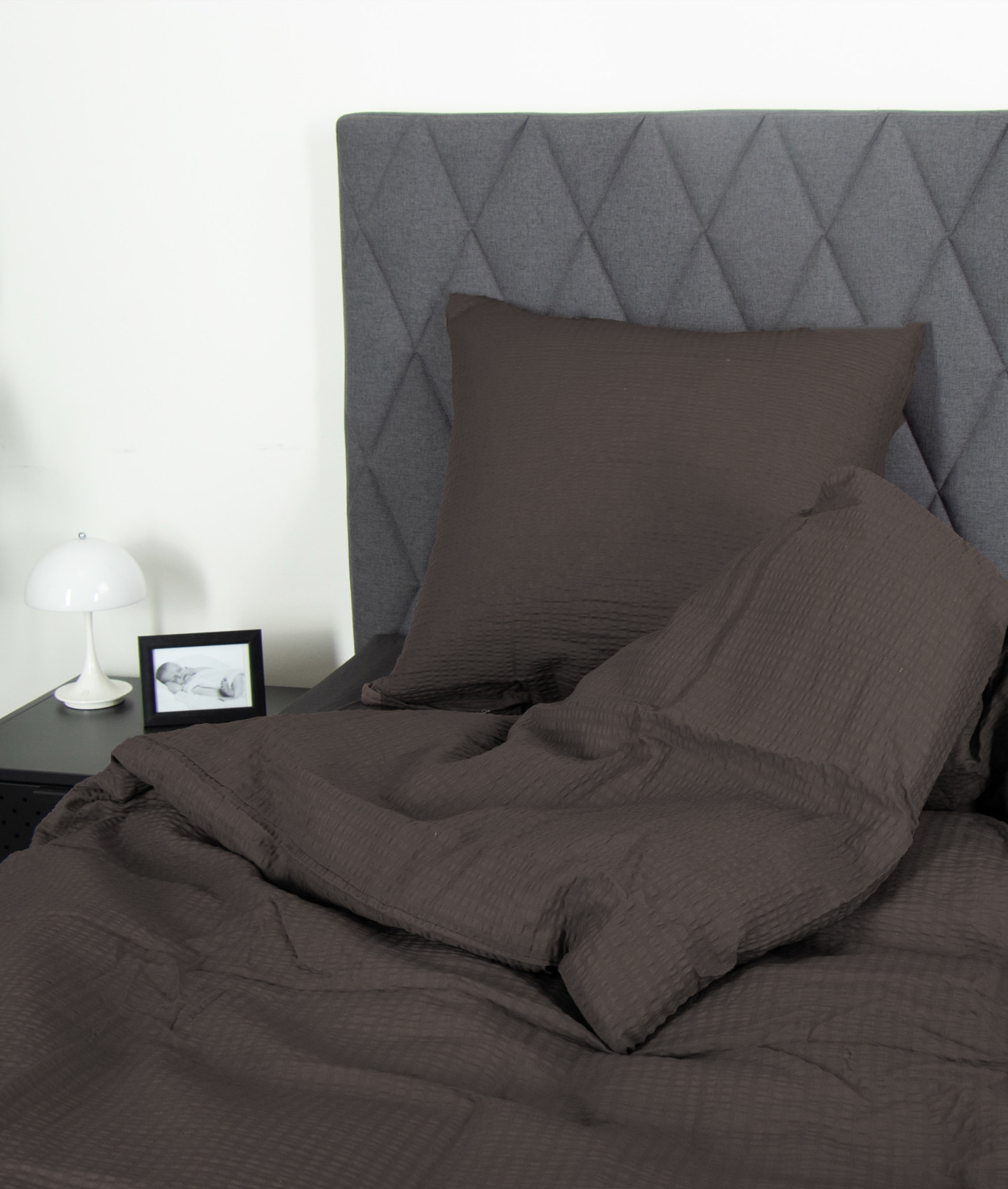 Forside »Sengetøy Sengetøy dobbeltdyne 200x220 cm - Kreppet - Grått sengetøy - By Night sengetøy i krepp 2 x putetrekkSpar31% By Night 1.299,00899,00NOKSpar 400,- Få på lager Trustpilot Antall Legg i kurv Se mer fra: By Night Artikkelnummer:268-5 Les vår sengetøyguide Se vårt store utvalg av laken Se vårt store utvalg av dyner 200x220 Har du spørsmål om produktet? Sengetøy - 200x220 cm100% bomull - kreppKreppet - Grå Dynetrekk: 200x220 cm Putetrekk: 2 stk. á 60x63 cm Materiale: 100% Kreppet - Kreppet Veving: 200 TC (trådantall = antall tråder per kvadrattomme) Farge: Grå Design: Ensfarget Brand: By Night Lukking: Dyne- og putetrekk med glidelås Vask: 60° Tørketrommel: Ja Tåler stryking: Ja Sertifisering: STANDARD 100 by OEKO-TEX® (2018OK0658) Kreppet sengetøy, også kalt krepp, er et glatt vevd bomullsstoff med en påsatt rynkeeffekt, som gir sengetøyet et flott utseende som ikke kan vaskes bort. "By Night" kreppet sengetøy er laget av 100 % bomull. Sengesettet er fargeekte, hvilket betyr at det holder på fargen etter gjentatte vask. Kjøp lette putetrekk til dine ekstra puter her Frisk opp sengen og soverommet med et flott og deilig sett med sengetøy som dette. Benytte samtidig muligheten til å sikre maksimal sovekomfort ved å legge til et nytt, mykt laken av høy kvalitet. Du finner vårt store utvalg av laken her By Night er kjennetegnet av dansk design - de gir deg behagelige sovekomponenter for nattemiljøet i aller høyeste kvalitet. By Night produserer sengetøy og laken for hele familien, og legger stor vekt på tidens trender slik at produksjonen alltid inneholder moteriktige farger og design. Tilbake til Sengetøy