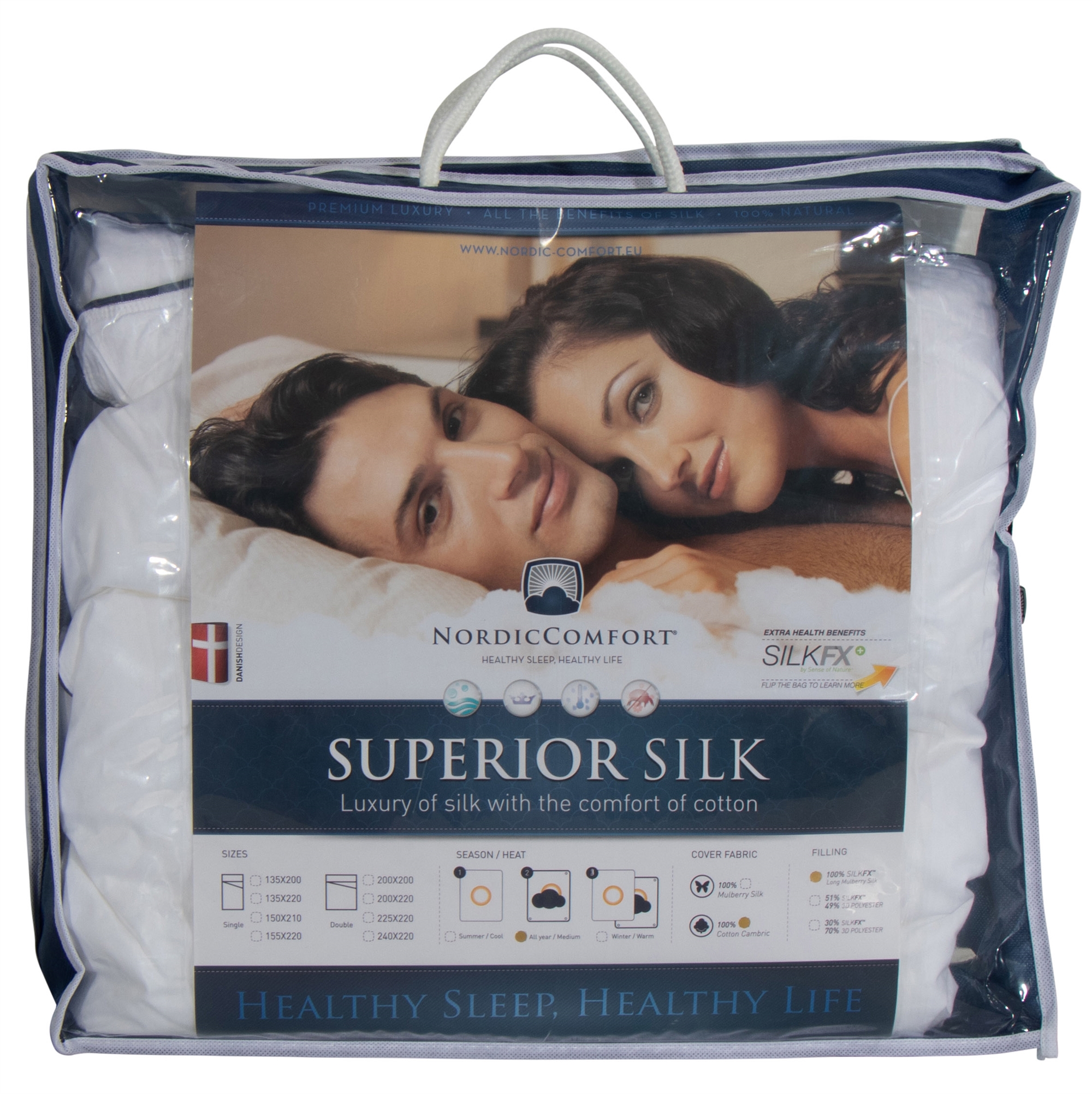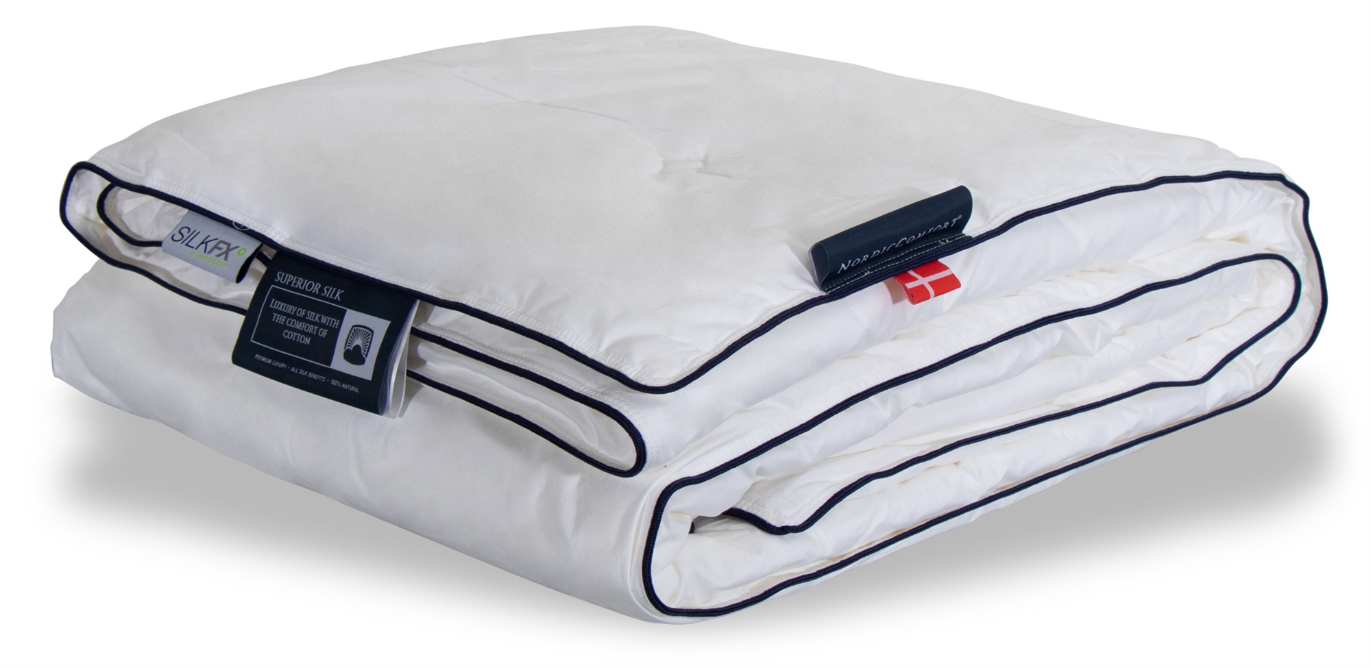 Forside »Dyner » Type dyne » Silkedyner Silkedyne 140x200 cm - Helårsdyne med 100 % langfibret morbærsilke - Nordic Comfort dyne Spar30% Nordic comfort 4.299,002.999,00NOKSpar 1.300,- På lager Trustpilot Antall Legg i kurv Se mer fra: Nordic comfort Artikkelnummer:5101 Les vår dyneguide Les om vedlikehold av dyner og puter Se vårt store utvalg av puter Har du spørsmål om produktet? Silkedyne - Superior silkeFra: Nordic Comfort100 % langfibret morbærsilke Størrelse: 140x200 cm Type: Helårsdyne lun Merke: Nordic Comfort - Superior Silke Fyll: Langfibret morbærsilke Silketetthet: 275 g/m2 Fyllvekt: 745 g Bolster: Myk eksklusiv tettvevd bomullscambric Vask: Ja, kan maskinvaskes (Viktig å bruke enzymfritt vaskemiddel) Garanti: 10 år Sertifisering: STANDARD 100 by OEKO-TEX® (SHHO 090844) Sertifisering: Crossvent Silk FX Leveres med en eksklusiv bæreveske Se alle våre silkeputer her SuperiorSilk-dynen er laget av SilkFX, som er langfibret morbærsilkefyll og med 100 % bomullscambric på utsiden. Bomullscambricen gjør at dynen føles mer som en tradisjonell dyne og er tyngre enn f.eks. Silk Excellence-dyne med silkevår. Superior Silk-dynen er med SilkFX-teknologi, så du enkelt kan vaske dynen hjemme. Vi anbefaler Superior Silk-dynen til deg som ønsker en dyne av høy kvalitet med silkens gode egenskaper, og som også vil ha muligheten til å vaske den hjemme. Denne silkedynen har 10 års garanti. Nordic Comfort® er Danmarks mest solgte type silkedyne! Det er selvfølgelig en grunn til det. Egenskaper: Luksuriøs silkefiber Opplev det ultimate innen sovemiljø Temperaturregulerende Forbedrer sunn og dyp søvn ved å tilpasse seg kroppstemperaturen din Allergivennlig Avviser husstøvmidd og allergener – færre allergiske reaksjoner Antibakteriell Renere og sunnere sovemiljø Fuktabsorberende Reduserer nattesvette og fuktig sovemiljø Pustende Lar kroppen din puste naturlig og reduserer overoppheting om natten Nordens mest solgte silkeprodukter er fra Nordic Comfort. Merket ble grunnlagt i 2007, og har som mål å produsere en deilig silkeserie av høyeste kvalitet for forbrukeren. Med hjelp fra deres søvneksperter kan du oppnå en optimal og forbedret natts søvn. Tilbake til Silkedyner