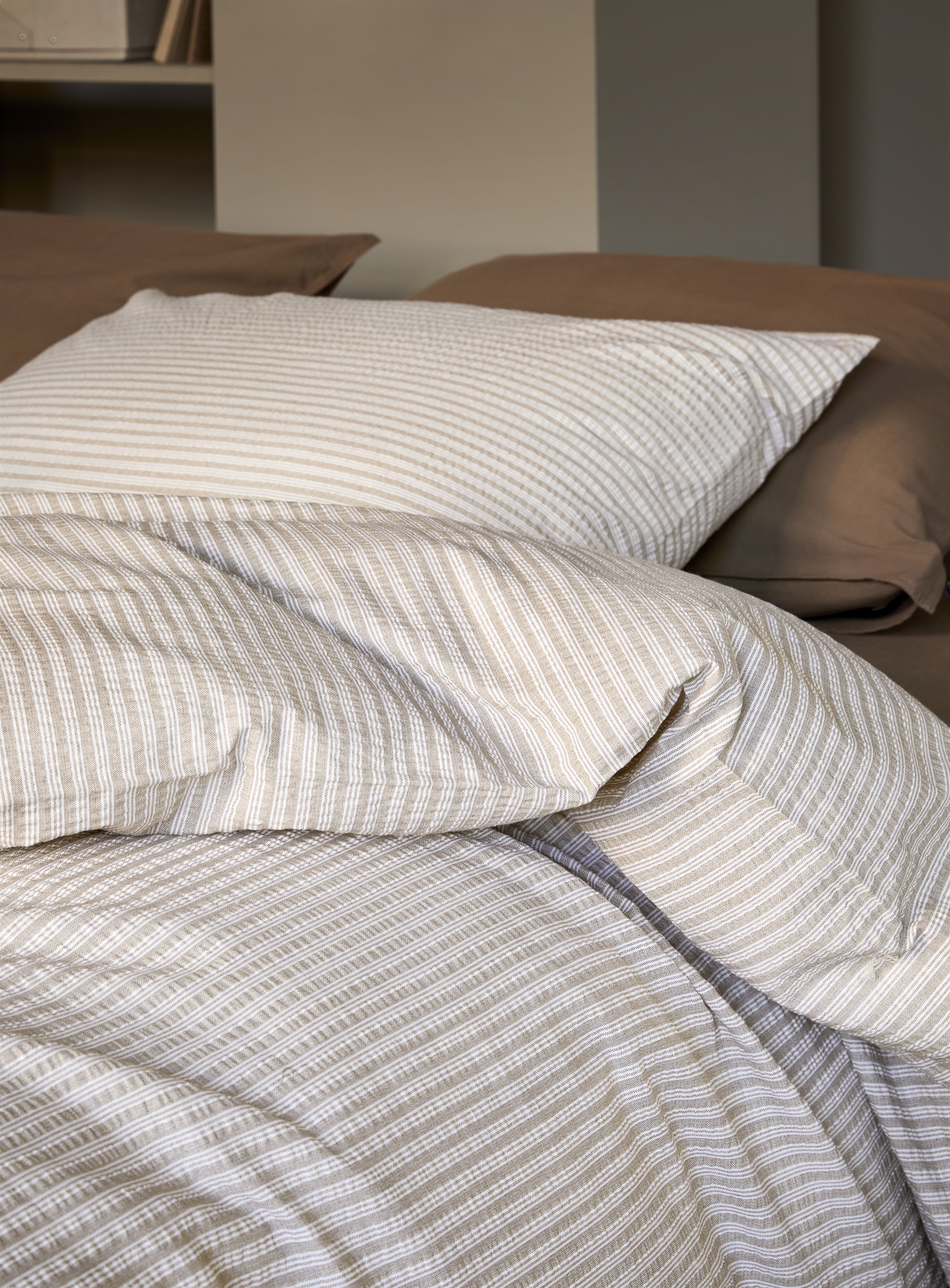 Forside »Sengetøy » Enkelt sengetøy » Ekstra langt sengetøy 140x220 cm Vevd krepp sengetøy 140x220 cm - 100% myk bomull - Brun med striper - Kreppsengetøy sengelinned - Slumre Høie Of Scandinavia Spar27% Høie Of Scandinavia 1.099,00799,00NOKSpar 300,- Få på lager Trustpilot Antall Legg i kurv Se mer fra: Høie Of Scandinavia Artikkelnummer:8351-2 Les vår sengetøysguide Se vårt store utvalg av laken Se vårt store utvalg av dyner 140x220 Har du spørsmål om produktet? OEKO-TEX® sertifisertMykt, lett og luftigEksklusivt luftig vevd krepp Dynetrekk: 140x220 cm Putetrekk: 1 stk. á 60x63 cm Materiale: 100% myk bomull - Vevd krepp Vev: 200TC Kreppsengetøy (Trådtetthet = antall tråder per kvadrattomme) Farge: Brun med striper Design: Slumre karamellbrun Merke: Høie of Scandinavia Lukking: Dynetrekk med glidelås, putetrekk med overlapp Vask: 60° Tørketrommel: Ja Stryking: Nei Sertifisering: STANDARD 100 by OEKO-TEX® (19.HIN.85821). Din garanti for at produktet er fritt for helseskadelig kjemi. De ekstra fine bomullstrådene skaper en delikat kreppvev. Perfekt for deg som elsker den myke og knitrende fornemmelsen. I vevd bomullskrepp i 100% bomull skapes de unike luftlommene i vevingen. Kreppvevingen er varm om vinteren og sval om sommeren, og gir en myk og sprø fornemmelse av krepp vask etter vask. En klassiker som ikke behøver stryking. Dette stripete Slumre sengetøy er produsert av 100% myk bomull med vevemetoden Bæk og bølge, også kalt bomullskrepp. Denne vevingen gir rynkeeffekten og skaper hulrom til små luftlommer i materialet, som gjør at sengetøyet oppleves lett, luftig og ofte svalere enn andre typer materialer. Om sommeren vil sengetøyet kjennes luftig, og om vinteren vil du kunne merke varmen fra den myke bomullen, noe som er en unik fordel denne kombinasjonen av materiale og veving gir. Sengetøysettet bør ikke strykes, da det har sine luftlommer i selve vevingen. Sengelinned med denne vevtypen er spesielt godt for deg som av og til opplever at du har det varmt om natten; her kan sengetøyet tilføre økt pusteevne og høy absorbering. Kjøp enkelt putetrekk til dine ekstra puter her Frisk opp sengen og soverommet med et flott og lekkert sengetøysett som dette. Benytt samtidig anledningen til å sikre deg maksimal sovekomfort ved å tilføye et nytt mykt laken av høy kvalitet. Du finner vårt store sortiment av kvalitetslaken her Høie er et skandinavisk merke som står for tradisjon forent med nytenkning. Firmaet har eksistert siden 1850 og har gjennom årene vært med på å forme og utvikle skandinavisk tekstil og design. Sengetøy fra Høie er hverdagsluksus som alle fortjener. Tilbake til Ekstra langt sengetøy 140x220 cm